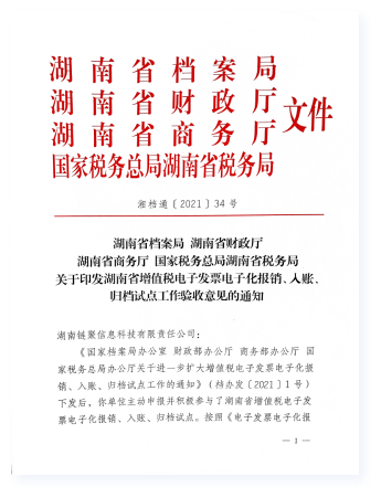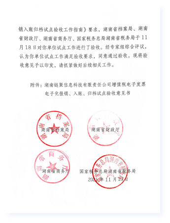 - 11月/2021验收通过2021年11月,湖南省档案局、财政厅、商务厅、国税总局湖南省税务局联合组织进行试点验收。湖南链聚信息科技基于自主研发的“四库档案管理系统”进行的试点方案和取得的试点结果,得到领导和专家的一致肯定,顺利通过试点验收。