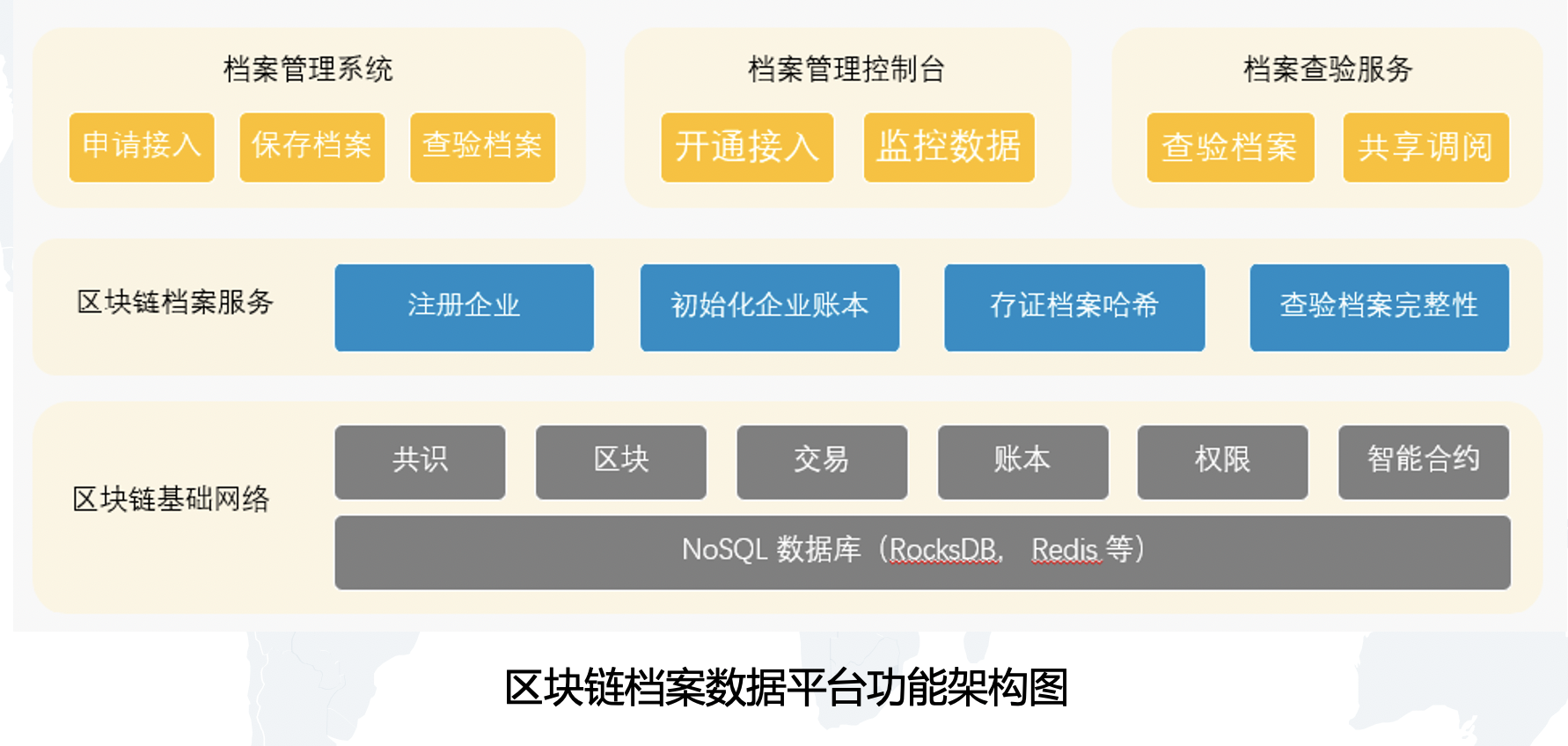 创新地将区块链技术运用到了档案领域,基于公司自主可控研发的区块链底层技术,采用SM2非对称加密和签名算法、SM3哈希算法等建立了区块链档案数据平台,实现了电子会计档案的四性检测和上链存证,保证电子会计档案在创建、归档、保存、移交、查询、利用全流程的真实性、完整性、防篡改。